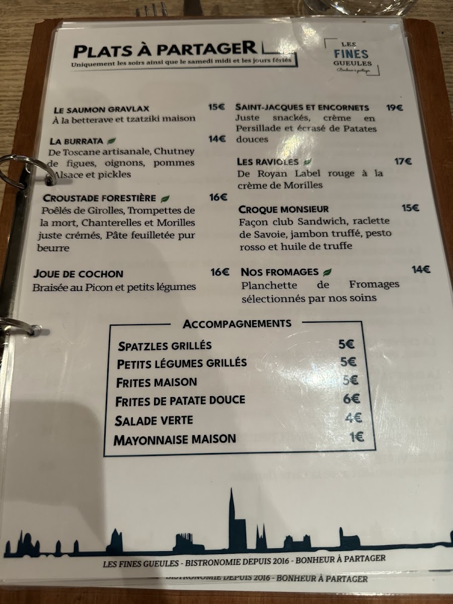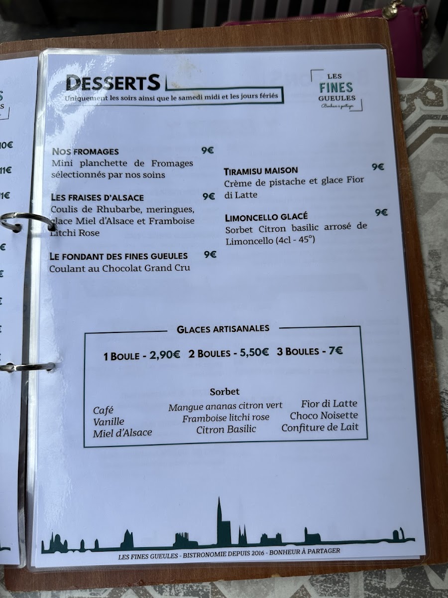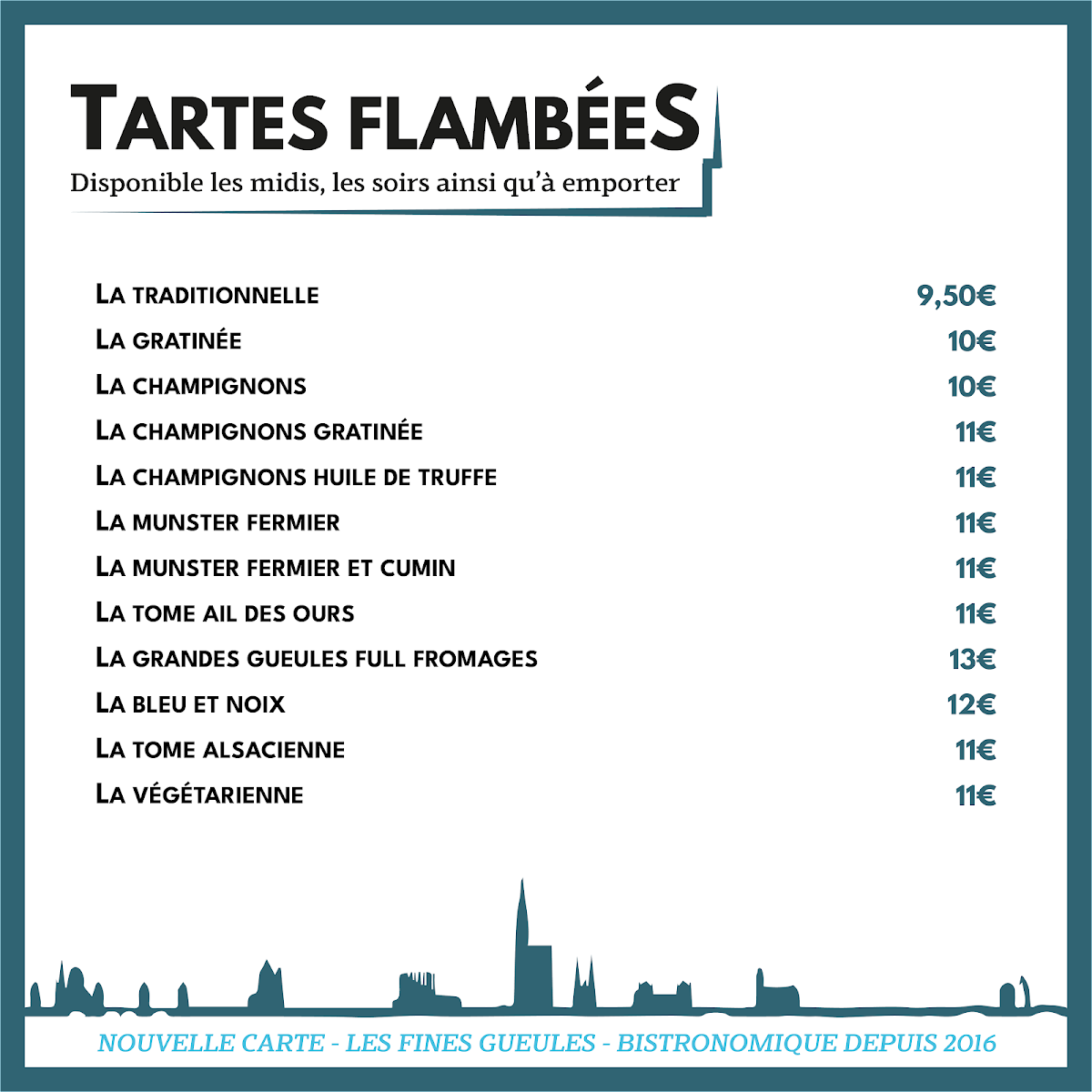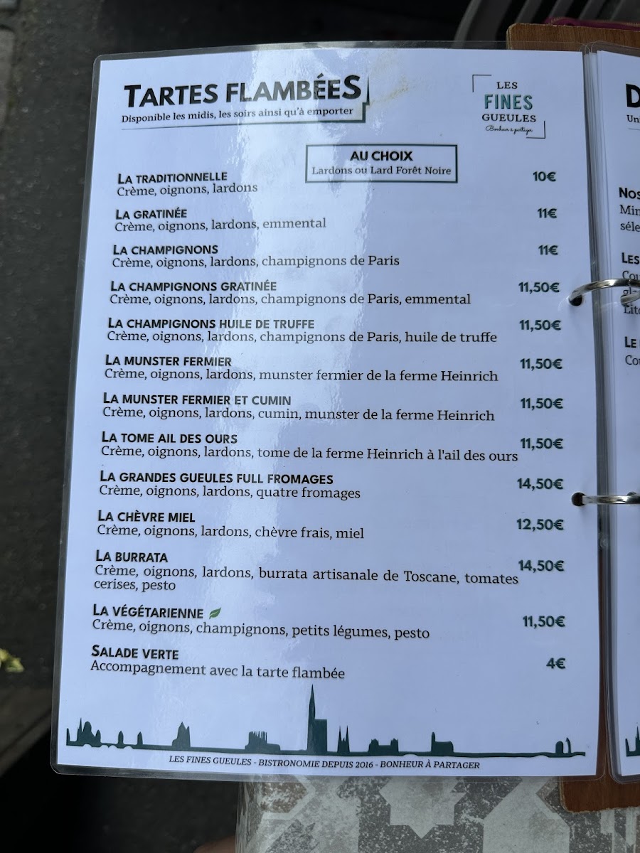 Welcome to Les Fines Gueules, a gem located at 5 Rue Gustave Doré in Strasbourg, where culinary creativity shines through an innovative, compact menu. This charming restaurant brings a delightful twist to traditional French and Italian dishes, primarily focusing on Tartes Flambées. Each tart features a perfect balance of crème, onions, and a selection of toppings, with prices ranging from €9.50 to €11.00.